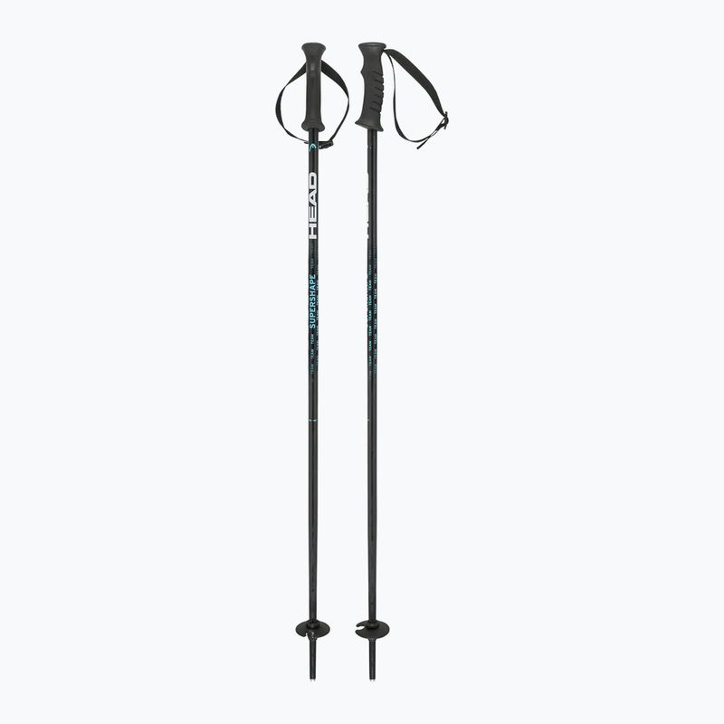 Adjustable HEAD Supershape Team Junior poles made of aluminium grow with the child. The junior diameter is 16/14 mm, featuring a plastic handle, automatic strap, Race basket, and a tip with a star-shaped end, ensuring control, comfort, and safety on the slope.