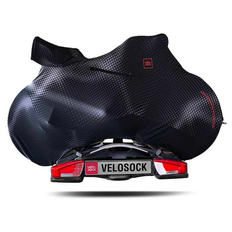 VELOSOCK bike cover Carbon Black MTB WR protects the bike from moisture and light rain during transport on almost any car roof rack. The elastic material and various attachment points ensure a stable fit, while additional pedal covers protect the bike from dirt and damage.