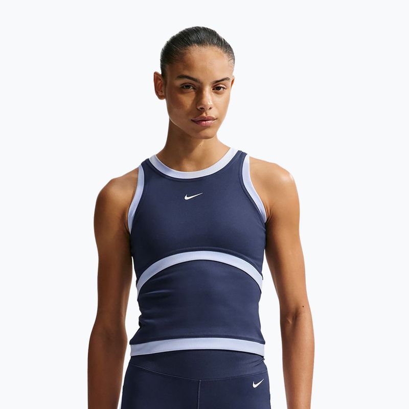 The round neckline and sleeveless design of the women's Nike One Dri-Fit training top midnight navy/hydrogen blue/white provide full freedom of movement. The tank top cut is not only fashionable but also practical, offering an excellent fit for the silhouette. The smooth pattern with a subtle Nike logo adds a stylish character that complements various sporty outfits.